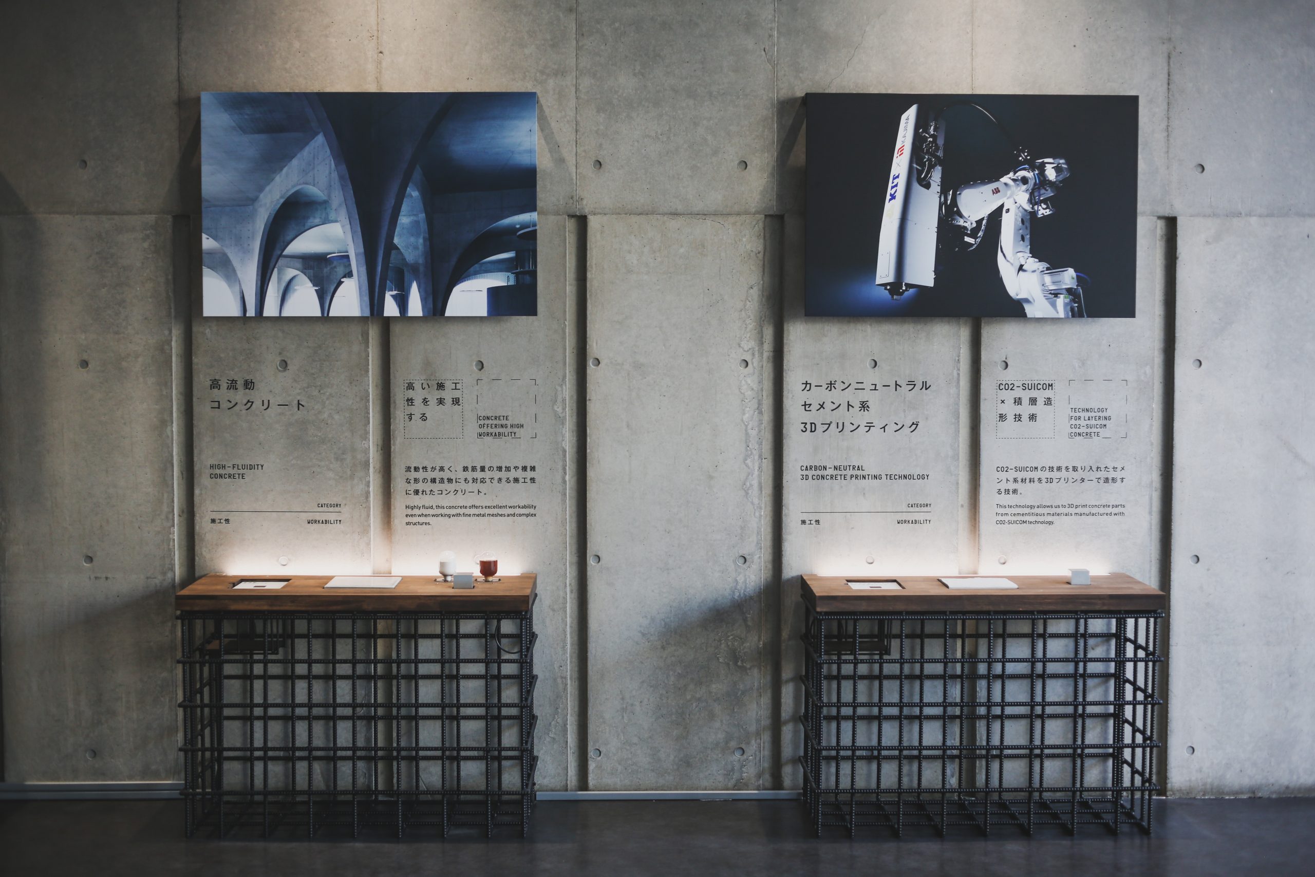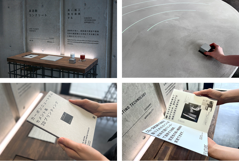 The panels in the exhibition area are made of large-size photographs that impressively convey the materials, features, and manufacturing process of each technology. The counter below the panels displays the actual concrete and other materials that make up each technology, an explanatory booklet, and a cube that plays the explanatory video.