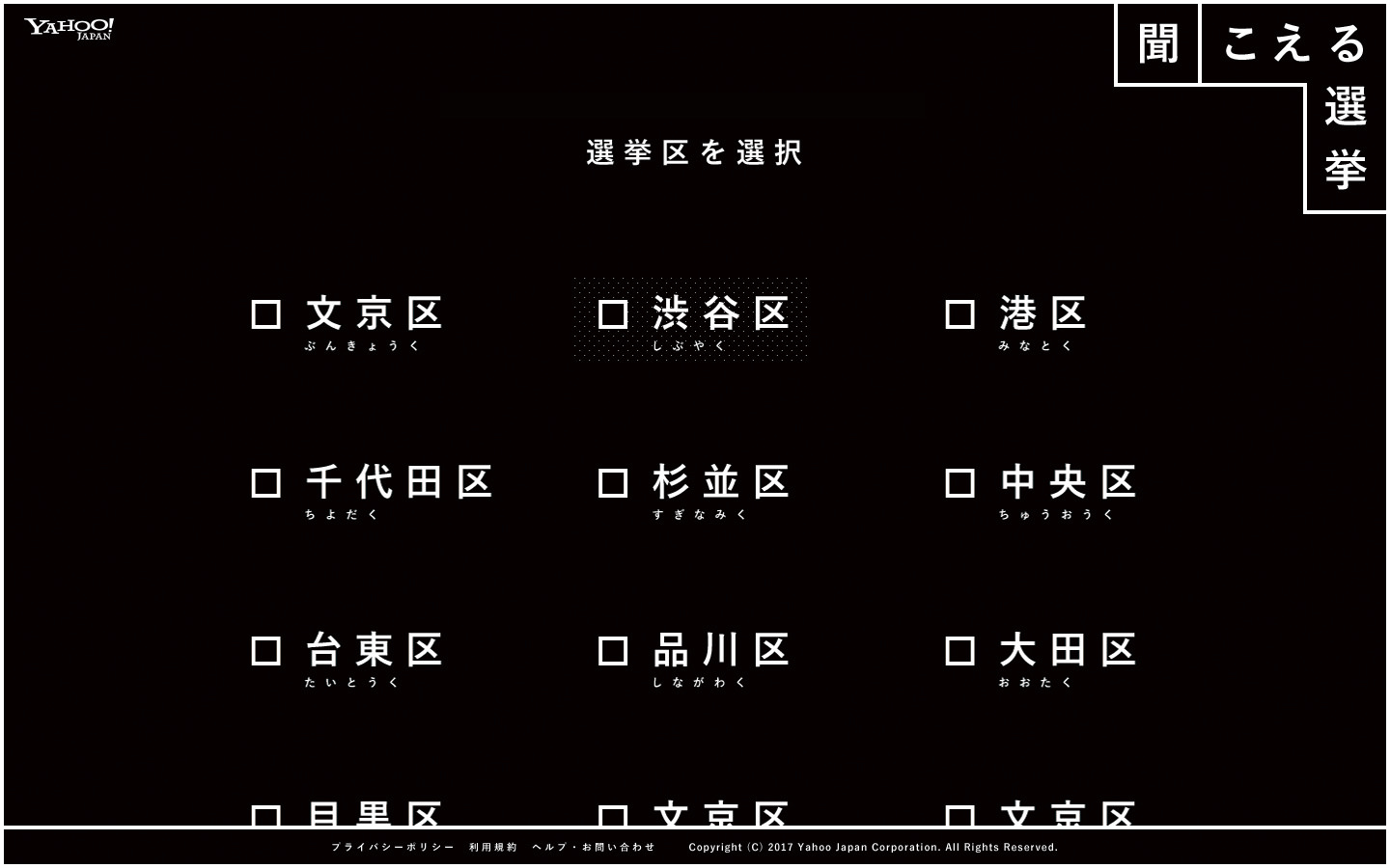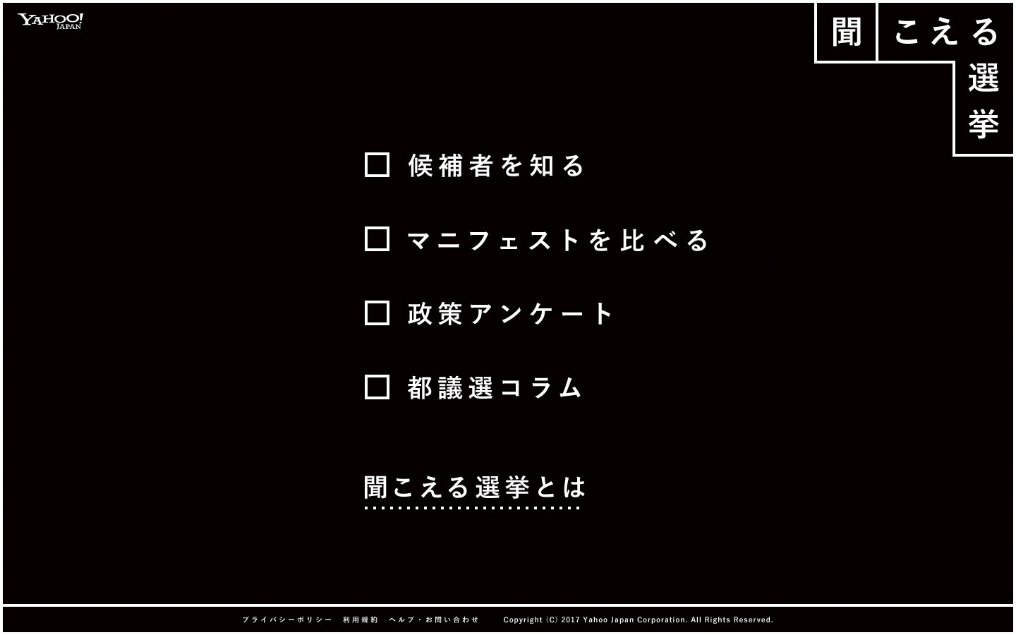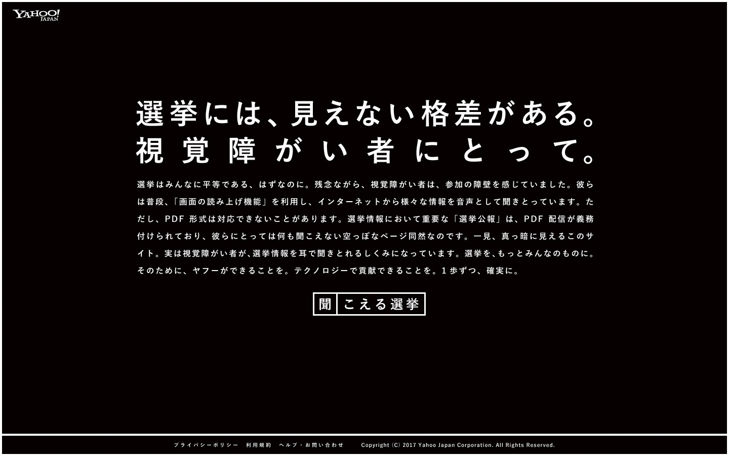Executive Creative Director:Yoshimitsu Sawamoto(DENTSU INC.)|Creative Director / Planner Akira Suzuki(DENTSU INC.)|Creative Director:Kazuyoshi Ochi(DENTSU INC.)|Creative Director:Togo Kida(DENTSU INC.)|Copywriter:Kenta Isobe(DENTSU INC.)|Art Director:Masanari Kakamu(DENTSU INC.)|Designer:Ryota Mishima(BIRDMAN inc.)|Account Executive:Michihito Nishizaki(DENTSU INC.)|PR Planner:Yohei Takahashi(Dentsu Public Relations Inc.)|PR Planner:Kazuya Watanabe(Dentsu Public Relations Inc.)|Producer:Eiko Shimada(freelance)|Director:Takuro Ito(BIRDMAN inc.)|Director:Saki Togashi(BIRDMAN inc.)|Technical Director:Takayuki Komatsu(BIRDMAN inc.)|Frontend Engineer:Kazuki Nakata(YAMA)|Backend Engineer:Masanori Nagamura(BIRDMAN inc.)|Researcher:Mayumi Morioka(BIRDMAN inc.)|Producer:Koichi Suzuki(Yahoo Japan Corporation)|Creative Director:Shinya Uchida(Yahoo Japan Corporation)|Creative Director:Jun Watanabe(Yahoo Japan Corporation)|Engineer:Masami Goto(Yahoo Japan Corporation)|Art Director:Kazuto Kitakado(Yahoo Japan Corporation)|Planner:Kazuaki Matsumura(Yahoo Japan Corporation)|Planner:Akihiko Maeda(Yahoo Japan Corporation)|Facilitator:Chikasa Komazawa(Dialog in the dark)|Facilitator:Akira Hiyama(Dialog in the dark)|Facilitator:Yohei Seto(Dialog in the dark)|Producer:Hojin Ishii(Niban-kobo Productions Corp.)|Producer:Yoshimune Takamatsu(Niban-kobo Productions Corp.)|Director:Satomi Inagaki(Connection Inc.)|Production Manager:Ryo Takashima(Niban-kobo Productions Corp.)|Production Assistant:Nana Arai(Niban-kobo Productions Corp.)|Videographer:Asami Koyama(Niban-kobo Productions Corp.)|Lighting Director:Keisuke Ikeda(Niban-kobo Productions Corp.)