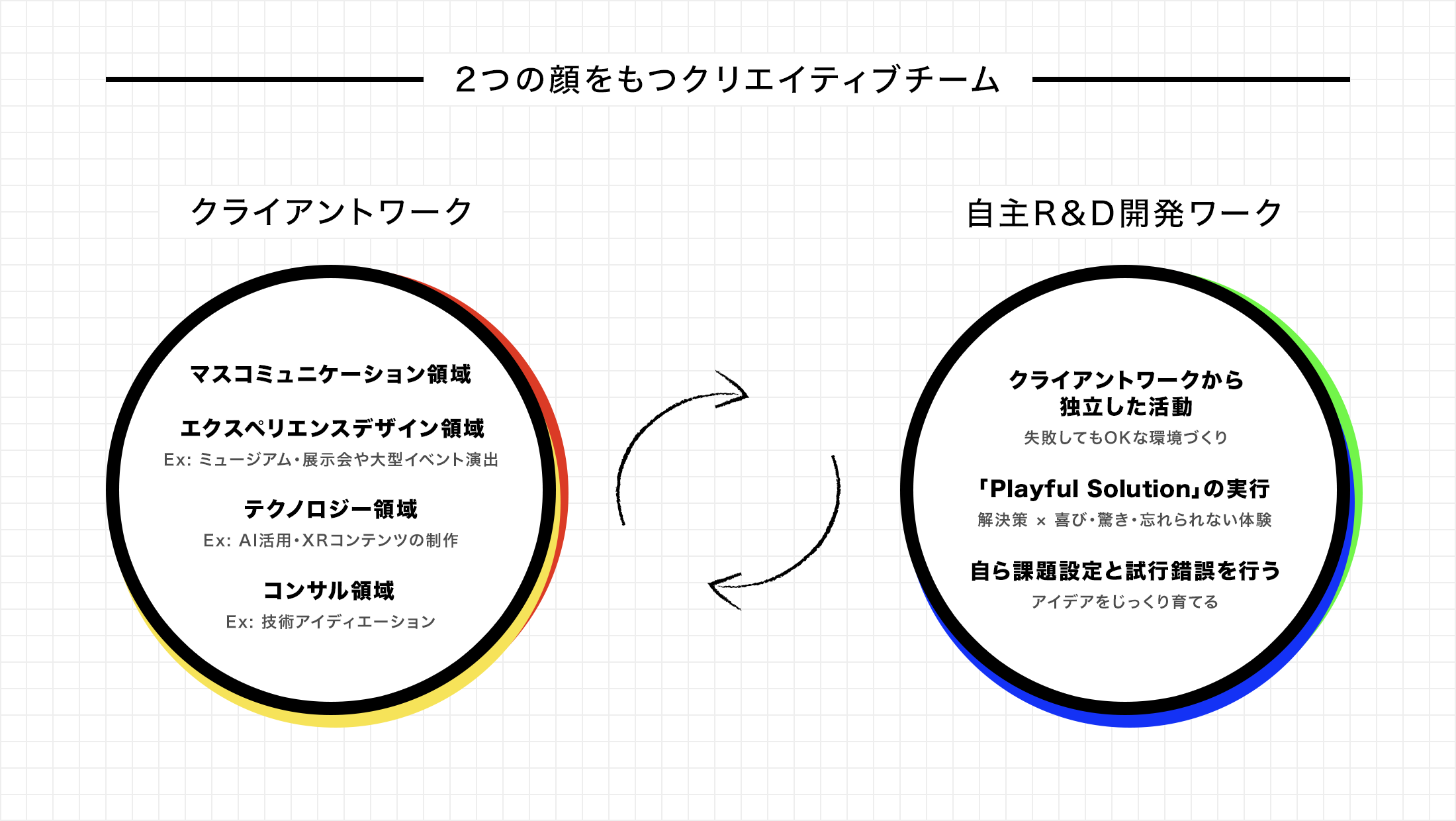 Dentsu Lab Tokyoは体験の面白さを提示するだけで終わらせず、そこから得られる発見をクライアントワークや社会課題の解決へとつなげていくことを大切にしています。遊び心は、その思考と実践を動かすための起点です。