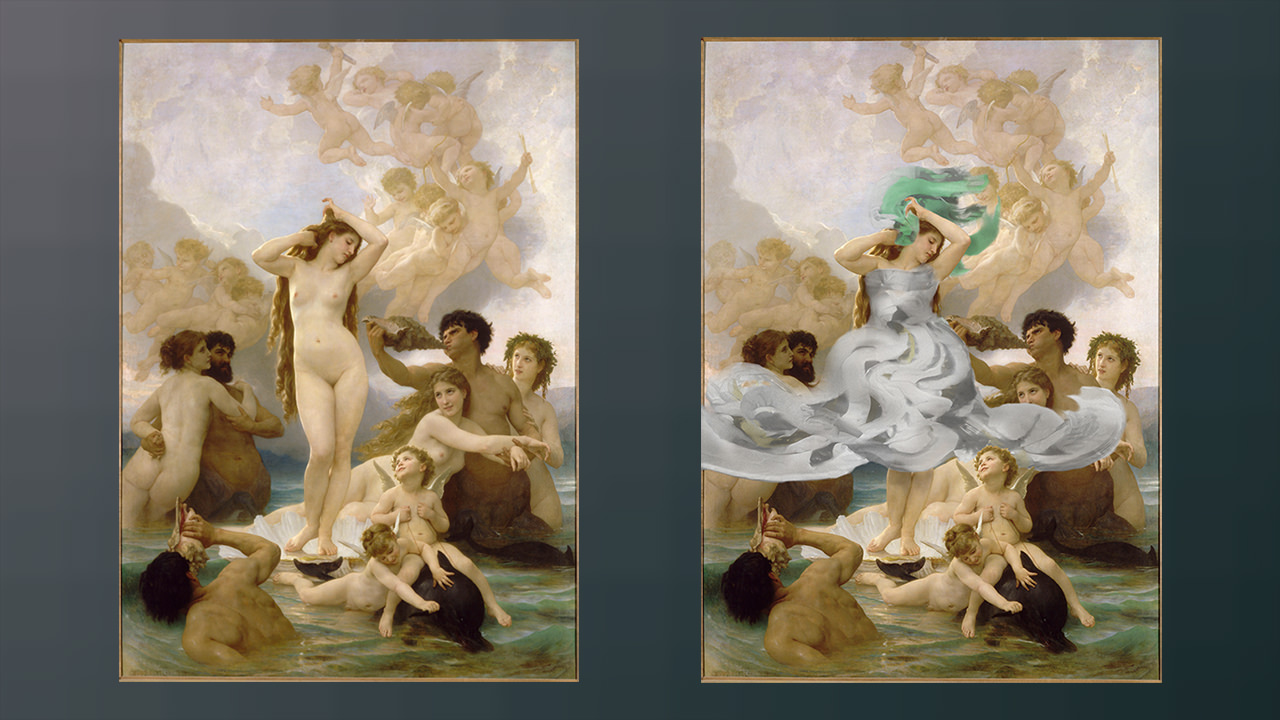 今回我々は、ドレスのデザインにVRの三次元ドローイングツールを利用。完成したVR上のドレスをペッパーズ・ゴーストによって会場内に立体的に再現し実在のヴィーナス像に「着せ」、来場客がHMDの装着無しに体験を共有できるようにした。さらに絵画の作者ブグローの絵のタッチを学習させたAIを使い、制作したドレスを元の絵画に合成。一点の「アート作品」として完成させた。